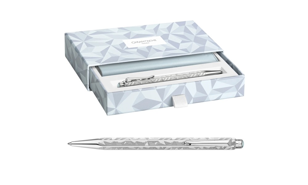 Experience the sparkle of sunlight on snow no matter the weather with the sophisticated finish and elegant deisgn of the Alpine Frost Special Edition Ecridor Ballpoint Pen Gift Set from Caran d'Ache.